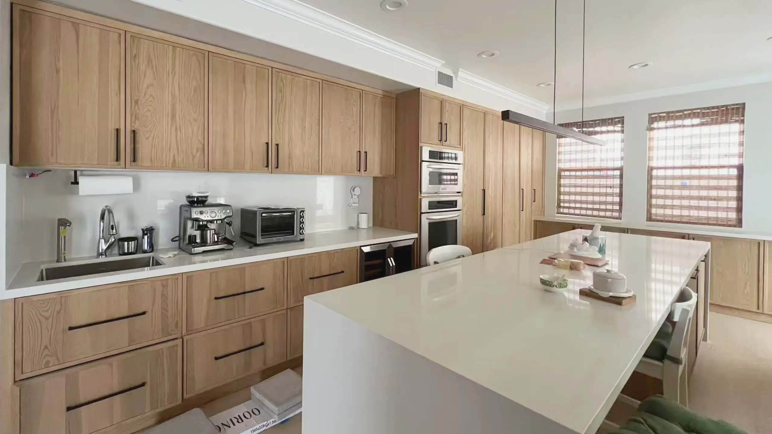 The formal living room is framed by crema marfil marble detailing and a custom mantel fireplace, complemented by Hunter Douglas Silhouette window treatments and bespoke valances. A sculptural circular staircase provides a graceful transition between levels, while the formal dining room opens through French doors to a side patio, creating an effortless indoor-outdoor connection accentuated by custom drapery.